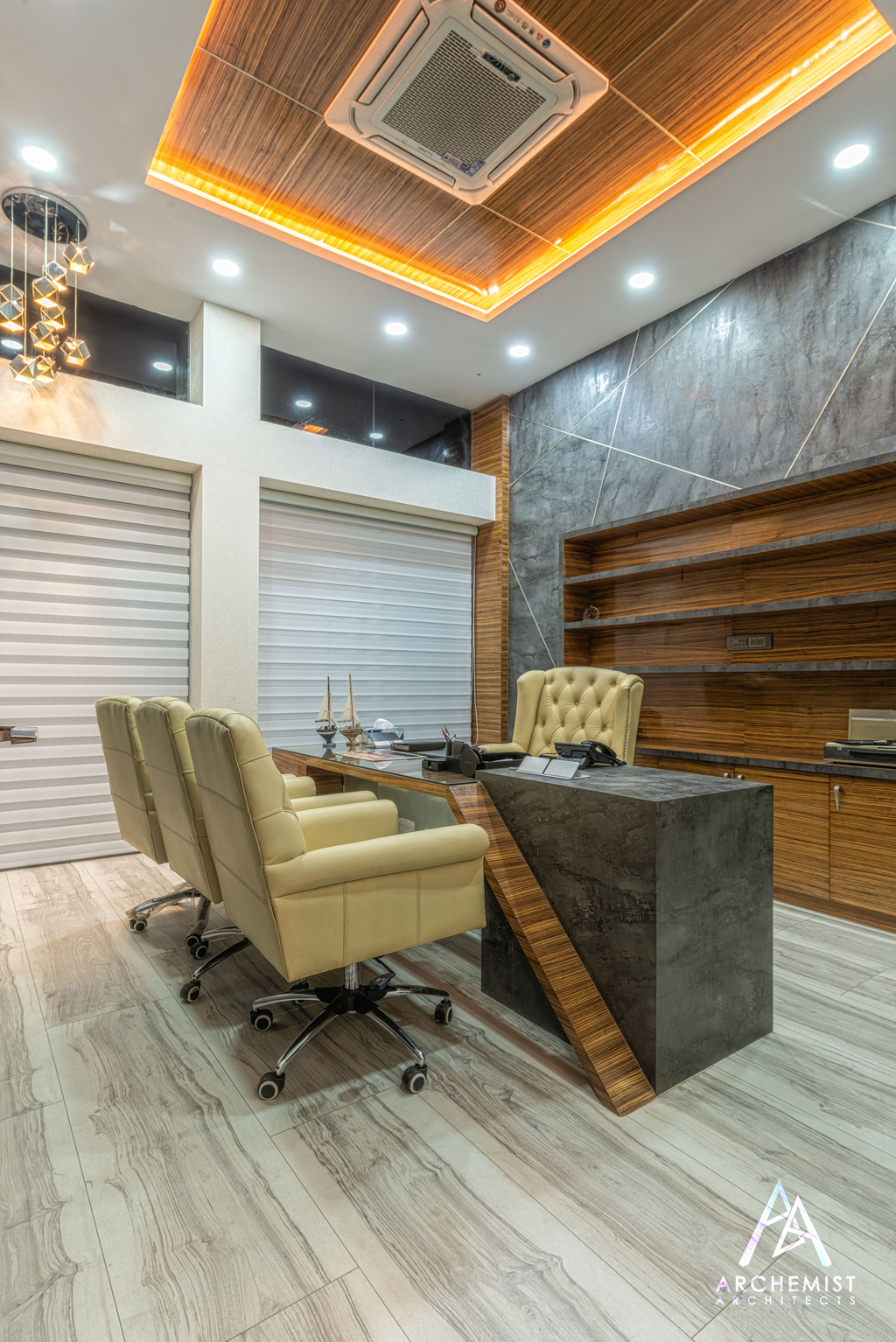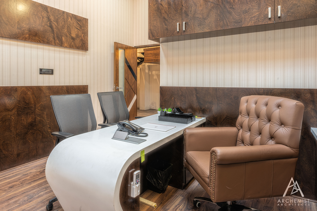 While minimalism defines the overall approach, textures play a crucial role in adding depth and character to the interiors. Thoughtfully chosen materials such as raw concrete, natural wood, and subtle fabric finishes bring an understated richness to the space. A combination of matte and glossy surfaces creates visual contrast, ensuring the office feels layered rather than stark.
