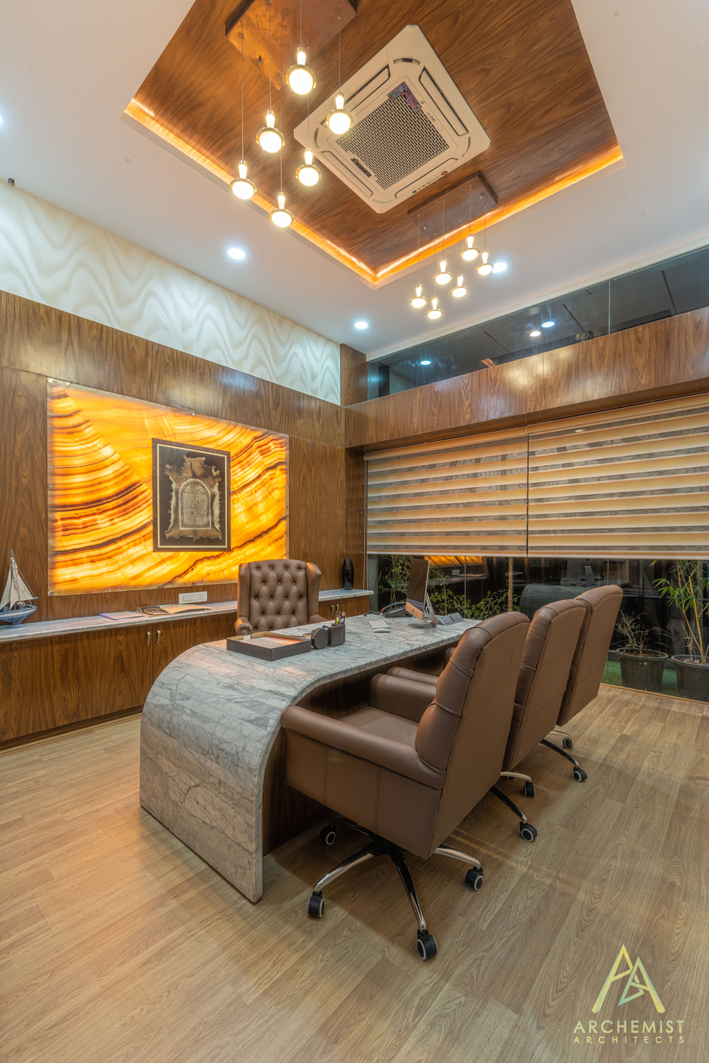 While minimalism defines the overall approach, textures play a crucial role in adding depth and character to the interiors. Thoughtfully chosen materials such as raw concrete, natural wood, and subtle fabric finishes bring an understated richness to the space. A combination of matte and glossy surfaces creates visual contrast, ensuring the office feels layered rather than stark.